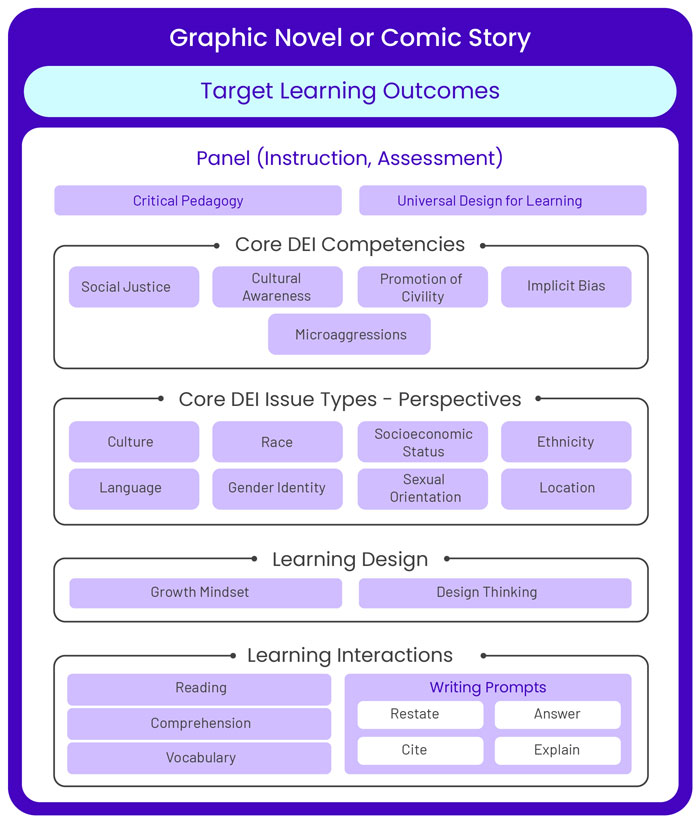 Figure: Conceptual framework for incorporating DEI into Comic Instruction learning design